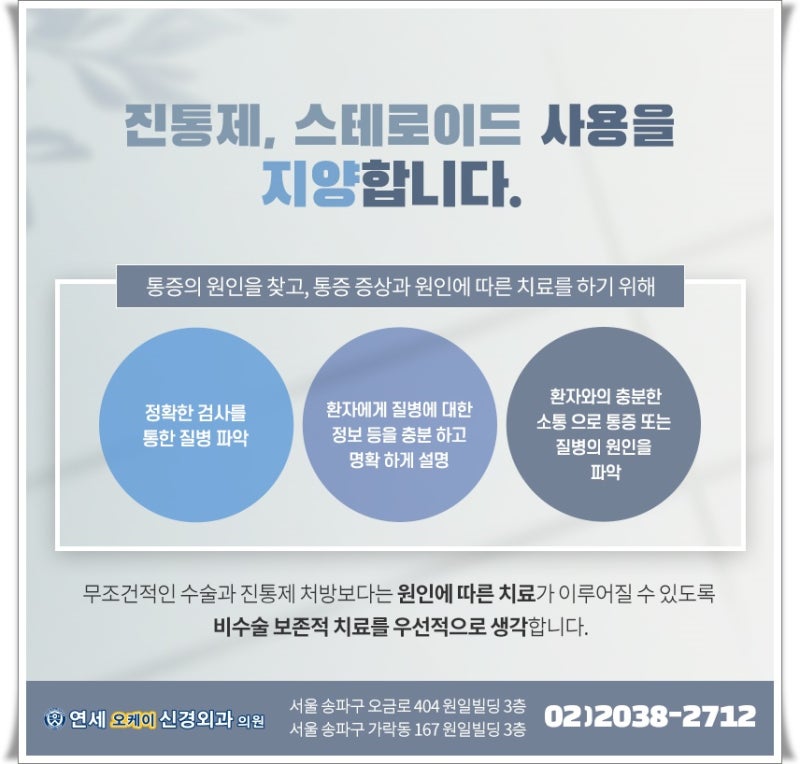 눈알이 아픈 느낌이나 구역질, 구토에 시달릴 수도 있고 빛을 보면 더 심해질 수도 있습니다. 다행인 것은 대개 하루 이내에 증상이 소실되고 다시 두통이 시작되기 전까지는 증상이 없다는 것입니다. 이것이 편두통의 전조증상입니다.눈알이 아픈 느낌이나 구역질, 구토에 시달릴 수도 있고 빛을 보면 더 심해질 수도 있습니다. 다행인 것은 대개 하루 이내에 증상이 소실되고 다시 두통이 시작되기 전까지는 증상이 없다는 것입니다. 이것이 편두통의 전조증상입니다.편두통의 진단과 치료에 있어서 대부분의 경우 대뇌의 구조적 원인 질환에 의한 경우보다는 두통 자체가 원인 질환인 경우가 흔합니다. 하지만 생명에 위협을 주는 뇌종양, 뇌졸중이나 실명 등과 관련된 혈관염으로 인한 편두통이 소수라도 발생하므로 진단과 치료가 신속히 이루어져야 합니다. 따라서 치료가 필요한 경우 신경외과를 통해 신속한 검사와 진단을 받아야 합니다.편두통의 진단과 치료에 있어서 대부분의 경우 대뇌의 구조적 원인 질환에 의한 경우보다는 두통 자체가 원인 질환인 경우가 흔합니다. 하지만 생명에 위협을 주는 뇌종양, 뇌졸중이나 실명 등과 관련된 혈관염으로 인한 편두통이 소수라도 발생하므로 진단과 치료가 신속히 이루어져야 합니다. 따라서 치료가 필요한 경우 신경외과를 통해 신속한 검사와 진단을 받아야 합니다.개롱역 신경외과, 연세오케이 신경외과는 무분별한 수술, 큰 시술치료 등은 꼭 필요한 질환 이외에는 피하고 있습니다. 대부분의 두통 환자는 비수술 & 보존적 치료로 개선이 가능합니다. 두통치료 솔루션은 약물치료→물리치료→도수치료→주사치료→운동치료→수술로 진행되고 있으며 환자의 증상과 연령 등에 따라 치료법이 달라질 수 있습니다.모든 질환이 그렇듯이 초기 치료가 가장 중요하며 증상을 방치할 경우 수술 치료로 이루어질 수 있으므로 증상이 의심되는 경우 가능한 빠른 시일 내에 검사와 진단을 통한 치료를 받으시기 바랍니다.모든 질환이 그렇듯이 초기 치료가 가장 중요하며 증상을 방치할 경우 수술 치료로 이루어질 수 있으므로 증상이 의심되는 경우 가능한 빠른 시일 내에 검사와 진단을 통한 치료를 받으시기 바랍니다.개롱역 신경외과는 비수술&보존적 치료를 우선적으로 고려하고 있습니다. 보존적 치료 시 눈대중이 아닌 정밀한 검사를 통해 환자 개인의 증상과 원인에 따른 맞춤 치료를 적용하고 있습니다. 주로 영상 촬영실이나 적외선 체온 검사실 초음파, 체외 충격파 치료실 등의 검사에 의한 데이터로 치료하고 있습니다.개롱역 신경외과는 비수술&보존적 치료를 우선적으로 고려하고 있습니다. 보존적 치료 시 눈대중이 아닌 정밀한 검사를 통해 환자 개인의 증상과 원인에 따른 맞춤 치료를 적용하고 있습니다. 주로 영상 촬영실이나 적외선 체온 검사실 초음파, 체외 충격파 치료실 등의 검사에 의한 데이터로 치료하고 있습니다.연세오케이 신경외과는 개롱역 3번 출구에서 도보 1분 거리에 있기 때문에 대중교통이나 도보로도 접근하기 쉬운 곳에 있습니다.개롱역신경외과, 연세오케이신경외과는 병원의 이익만을 위한 무조건적인 치료방법을 권하기보다 명확한 진단을 바탕으로 환자분들에게 정말 도움이 되는 치료를 위해 노력하고 있습니다. – 대표원장 배영식 50m 네이버 더보기 / 오픈스트리트맵지도데이터x 네이버 / 오픈스트리트맵지도컨트롤러 범례부동산대로읍,면,동시,군,구시,도국연세오케이 신경외과의원 서울특별시 송파구 오금로 404원 일빌딩연세오케이 신경외과의원 서울특별시 송파구 오금로 404원 일빌딩