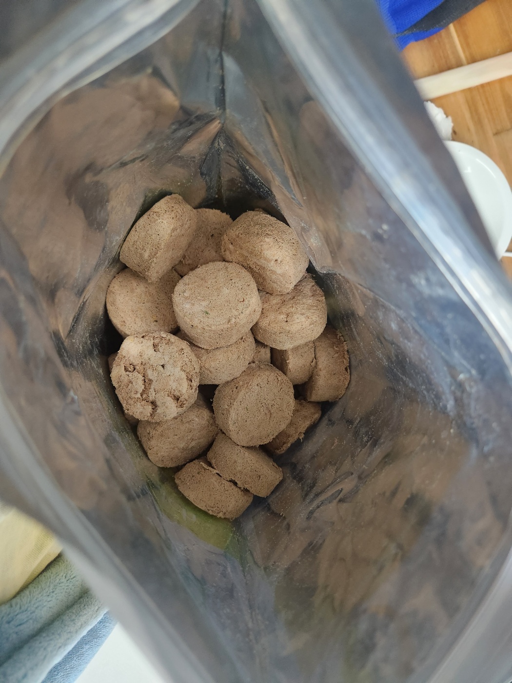 작은 패티는 이렇게 동그란 패티로 되어있고 패티 하나의 무게는 약 7g 입니다. 저희 강아지는 거의 5kg이라 하루에 패티 4장이 권장량입니다. 작은 밭을 기존 사료에 섞어 매일 아침저녁으로 패티 1장을 담가서 사료에 섞어줍니다.
