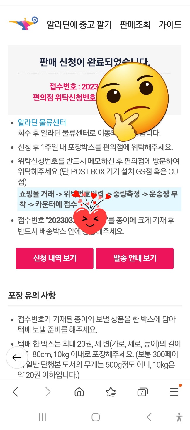 먼저 알라딘 웹사이트에서 알라딘에게 판매하고자 하는 앨범 또는 DVD 아이템을 등록해야 합니다. 그러면 접수번호/편의점수탁신청번호가 나옵니다.