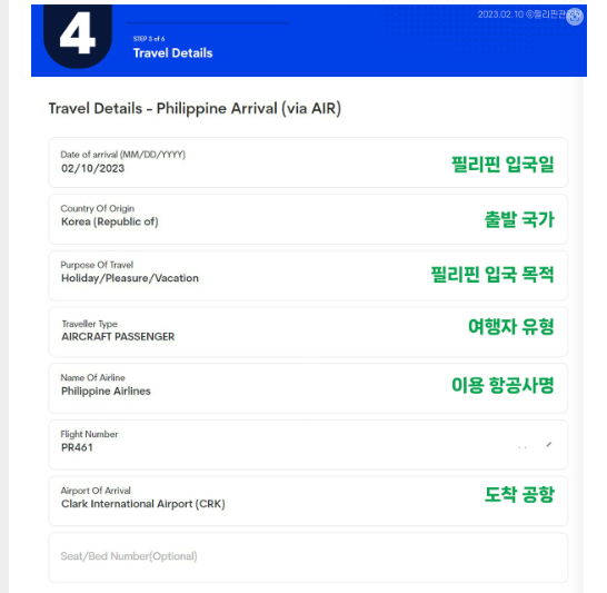 필리핀 도착일을 월/일/년 순으로 입력합니다.(참고: 이것은 승선 날짜가 아닙니다!!)