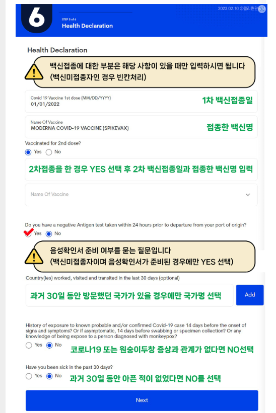 코로나19 예방 접종을 하지 않은 승객은 코로나19 진단서(탑승 24시간 전으로 제한)가 필요하며, 위 사진 중간 느낌표입니다. 이 경우 YES를 선택하십시오.