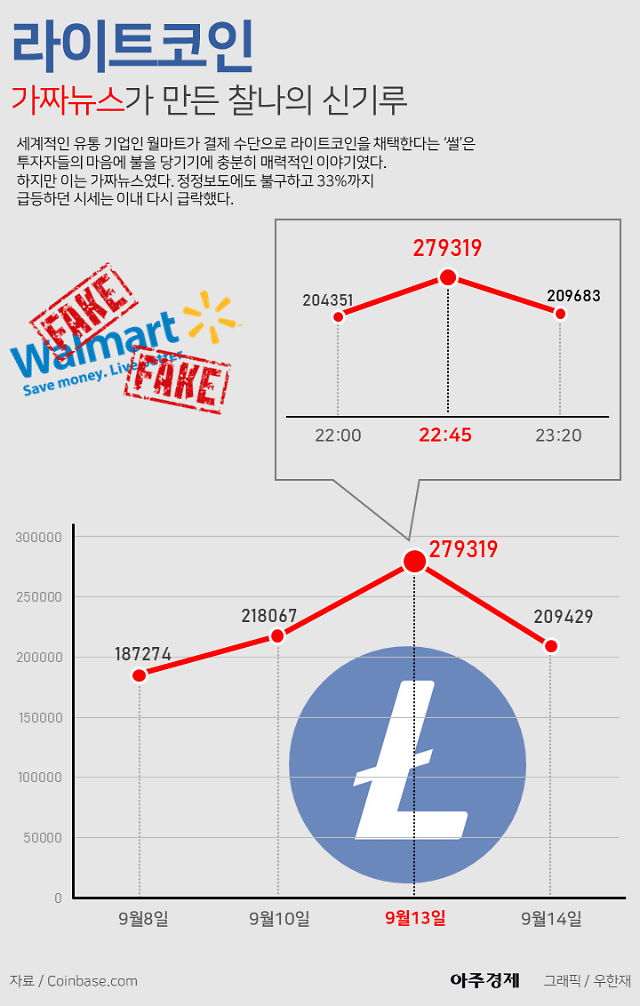 2021년 9월 13일 Walmart 결제에 대한 허위 정보 유포월마트가 라이트코인을 출시한다는 소식이 나오자 21만원대에서 횡보하던 가격대가 34만원대까지 치솟았다.