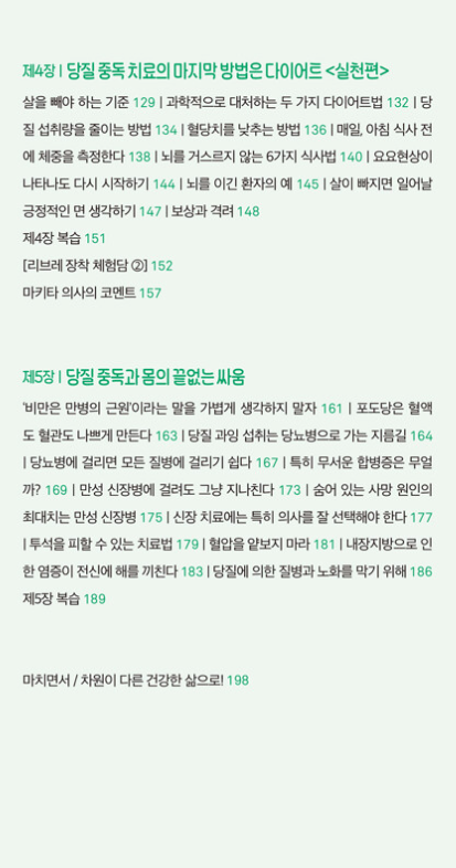 전자책 테이스팅북의 내용 중 일부를 읽고 자신의 취향에 맞는지 확인할 수 있습니다.이전 이미지다음 Millie의 도서관 저자 소개 및 목차 “탄수화물 중독” 나도 모르게 심각해진다 비만인 사람들은 단순히 스스로를 조절한다 내가 못 먹어서 많이 먹는 것이 아니다. 다만 뇌가 설탕 중독으로 인해 설탕을 섭취해야 하는 상황에 처한 것일 뿐입니다. 그들은 부주의한 중독의 희생자입니다. 탄수화물은 단지 설탕처럼 달콤한 것을 의미하지 않습니다. 사람을 비만하게 만드는 탄수화물은 밥, 빵, 국수 등 달지 않은 탄수화물이 대부분이며 대부분의 비만인 사람들은 밥이나 국수를 즐겨 먹는다. 그렇다고 비만인 사람들이 이것들을 먹게 만드는 것은 단순히 폭식 때문이 아니라 그것들을 먹도록 강요하는 뇌의 상태입니다. 아무도 그들이 원하기 때문에 체중을 늘리지 않습니다. 건강검진에서 “대사증후군”은 매우 중요합니다. 그런데 그런 말을 아무리 들어도 쉽게 살이 빠지지 않고, 게다가 매년 살이 찌고 계시죠? 아니면 살이 좀 빠졌다가 다시 요요현상이 나타난건가요? 살빼기가 왜이렇게 힘들까요? 당신이 미식가이기 때문에? 의지가 약해서? 아니요. 살이 빠지지 않는다면 그것은 당신이 설탕에 중독되었기 때문입니다. 해독되지 않으면 원발성 비만을 없애기가 어렵습니다. 설탕 중독은 비만한 사람들만의 문제가 아닙니다. 쇠약해진 젊은 여성들 사이에서도 중독 환자들이 많다. 식사대용으로 편의점에서 산 탄산음료나 주스, 과자 등을 먹기도 했다. 그들이 어리석기 때문이 아닙니다. 다만 뇌에 이상이 생겨서 이렇게밖에 못먹게 되네요. 저자가 설탕 중독이라는 단어를 그렇게 강하게 붙인 이유를 이해할 수 있습니다. 많은 사람들이 단 것을 먹지 않고는 현대 사회에서 살아남을 수 없기 때문입니다. 문제는 현대인이 당분을 너무 많이 섭취하고 활동량이 적어 비만이 전 세계인의 문제가 되고 있다는 점이다. 설탕 중독을 이해한다면 식습관 개선에 큰 도움이 될 수 있습니다. 나도 이 책을 읽고 내가 설탕 중독자라는 것을 깨닫지 못했다. 그러나 현대인의 비만은 저자의 지적처럼 개인의 자기관리 실패로 볼 수 없는 문제라는 생각이 들기 시작했다. 지난 40년 동안 당뇨병 전문의로서 의료계를 유지하면서 20만 명이 넘는 환자를 진료했습니다. 당뇨병과 설탕 섭취는 뗄래야 뗄 수 없는 관계이며, 지금은 설탕에 대해 누구보다 잘 아는 의사가 되었습니다. 탄수화물은 생각보다 훨씬 멍청하고 무섭고 당뇨병이 없는 건강한 사람도 중독되기 쉽습니다. 그 결과 살이 찔 뿐만 아니라 자신도 모르는 사이에 건강을 심각하게 해치게 되는데 암은 현대인들이 가장 피하고 싶은 질병이 아닐까 합니다. 또한 설탕 중독은 심근 경색, 뇌졸중, 만성 신장 질환, 알츠하이머 등과 같은 심각한 질병의 근원이라고 생각합니다. 현대인의 건강관리라는 주제를 가지고 있습니다. 설탕 중독에 대해 알게 된 후, 나는 무심코 탄수화물 섭취를 크게 줄일 수 있었습니다. 특히 내 단골 커피는 나에게 큰 문제입니다. 매 식사마다 먹는 음식의 양을 무시할 수 없으며 끊임없이 단 것을 찾고 있다는 것을 깨닫습니다. 설탕 중독에 대해 알고 나니 다이어트가 그리 어렵지 않다는 걸 깨달았다. 느낄 수있어. 설탕이 무엇인지 이해하면 쉽게 살을 뺄 수 있습니다. 계속해서 반복되지만 정말 중요한 사실은 비만은 설탕중독이라는 질병이 원인이라는 것입니다. “과식을 자제할 수 없는 사람”이 비만이 된다는 사실을 아는 한, 체중 조절은 어려울 것입니다. “뇌는 밥이나 국수 같은 탄수화물, 가당 청량 음료, 과자를 참지 못합니다.” “중독” 때문에 자신이 뚱뚱하다는 사실을 깨닫지 못하면 비만에서 벗어날 수 없습니다. 즉, 설탕이 무엇인지 알고 적당히 섭취하면 쉽게 체중을 관리할 수 있다. .내 환자와 나는 할 수 있습니다. 단맛도 나지 않는데 탄수화물이 왜 이리도 안 좋고 비만의 원인이 되는 걸까요? 이 책 외에도 다른 책들도 현대인들은 과도한 탄수화물 섭취로 인해 과도한 음식 섭취를 하고 있다고 합니다. 나는 또한 전에 그렇게 많은 탄수화물을 먹고 있다고 생각한 적이 없습니다. 그리고 초콜렛이나 사탕을 잘 먹지 못해서 단 음식을 많이 먹지 않는 것 같아요. 야채주스나 과일주스도 몸에 안 좋은 영향을 끼친다. 큰 밥 한공기를 시켜 배부르게 먹었는데 2시간 지나니 식욕이 돌아오고 미쳐버릴 것 같다. “당류중독의 대표적인 증상이라는 환자분들의 이야기를 자주 듣습니다. 밥, 야채주스, 과즙, 메밀국수 등 몸에 좋다고 하는 음식들이 사실은 몸에 안 좋습니다. 점점 더 많은 설탕은 의문의 여지가 있으며, 설탕 중독을 이해하는 키워드는 “혈당 수치”입니다. 독자들은 이미 건강 검진을 통해 자신의 혈당 수치를 측정했을 수 있습니다. 여기에 제시된 증상이 있을 때, 그들의 혈당 수치가 롤러코스터처럼 급격하게 오르락내리락하는데 우리는 흔히 당 수치가 떨어졌다고 하는데, 이는 설탕 중독과 관련이 있다. 멍하니 있다가 혈당이 오르면 일시적으로 기력이 올라간다 대부분의 사람들은 아마 다 가봤을 것이다 그