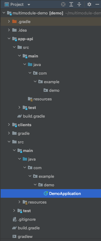 참고로 아래 클라이언트 모듈은 동일한 폴더 구조를 가지지만 그렇지 않으면 다른 모듈에서 @Component로 설정한 빈을 참조할 수 없다. 물론 SpringBootApplication의 scanBasePackages 옵션으로 해결할 수 있지만 이 방법은 모듈을 추가할 때 옵션을 추가하는 것은 비실용적이다.